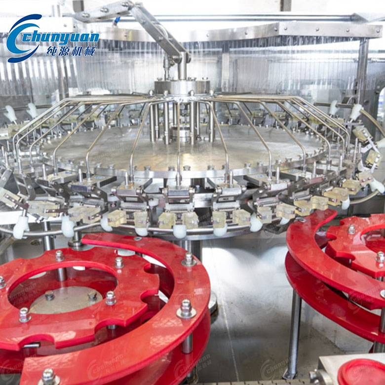可樂汽水設(shè)備可靠:整機(jī)采用卡瓶頸懸掛運(yùn)行工態(tài)設(shè)計(jì),克服了由于瓶壁薄、瓶高度誤差而引起的機(jī)器不能正常運(yùn)轉(zhuǎn)的因素,更換瓶型方便快捷。