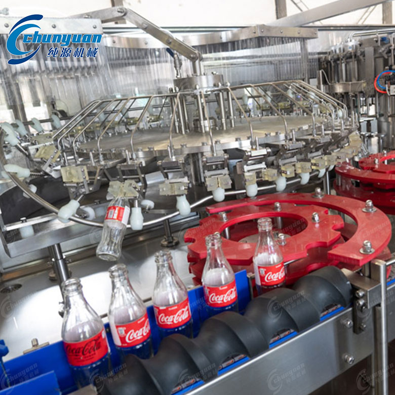 可樂灌裝機(jī):采用等壓灌裝原理,包括沖洗、灌裝、封蓋等功能,適用于玻璃瓶的灌裝。