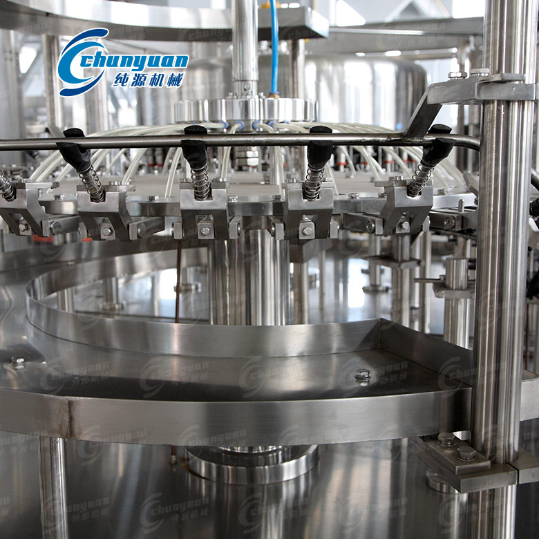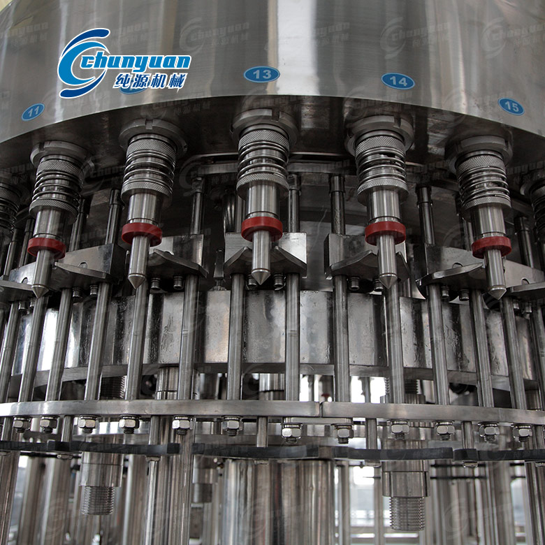 全自動(dòng)飲用水灌裝機(jī)械采用卡瓶頸傳動(dòng)技術(shù),實(shí)現(xiàn)全自動(dòng)沖瓶、灌裝、旋蓋等工序,自動(dòng)化程度高。
